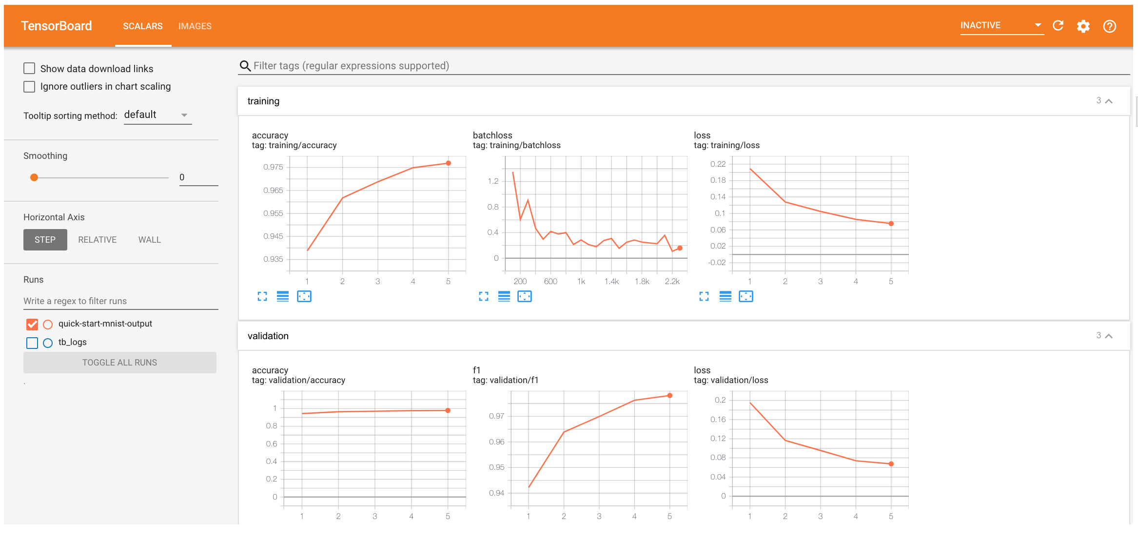 Next, the common.setup_tb_logging method returns a TensorBoard logger which is automatically configured to log trainer's metrics (i.e. batch loss), optimizer's learning rate and evaluator's metrics.